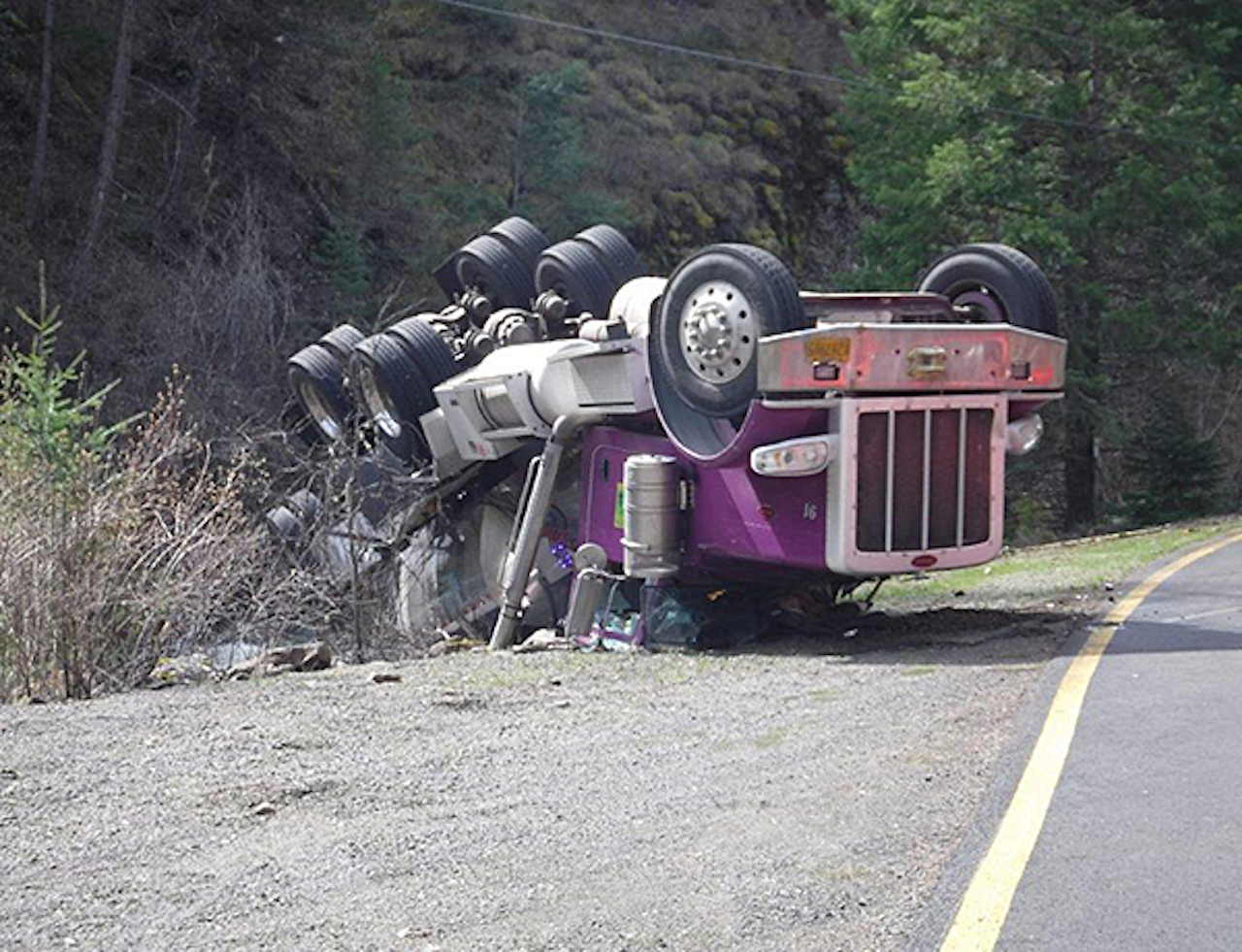 The ODFW employee who was driving the truck is safe but received minor injuries. The accident occurred on a sharp corner with the 53-foot truck rolling onto the passenger side, skidding on its side on the pavement, and then going over a rocky embankment causing it to roll onto its roof.