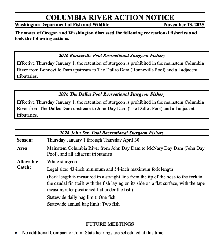 Technically, what happened today is that WDFW’s Charlene Hurst agreed Washington would close sturgeon retention in the Bonneville and The Dalles Pools starting January 1, effectively matching what is in ODFW’s permanent regulations.