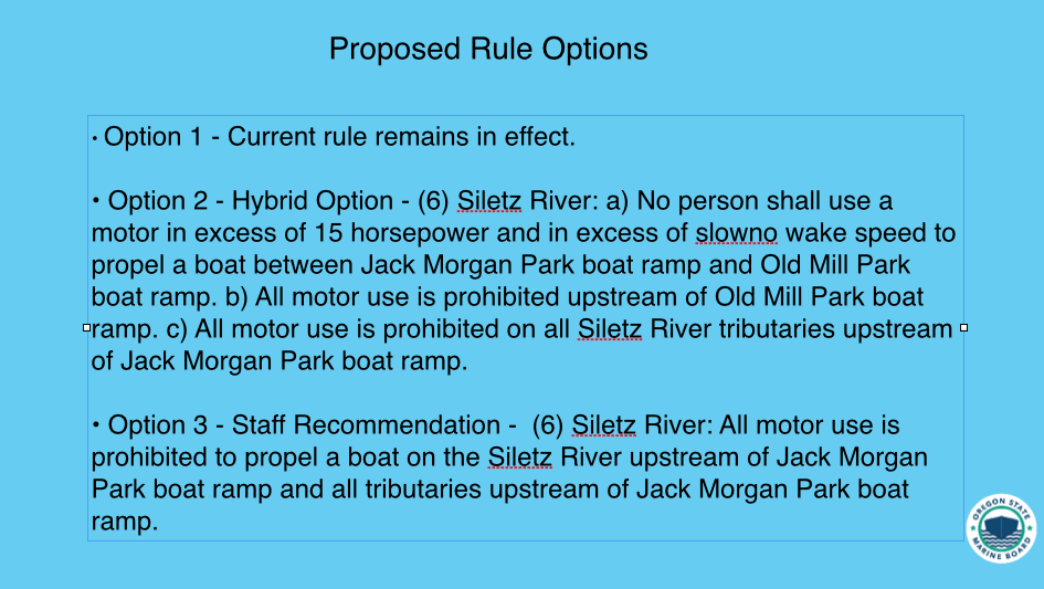 The public rulemaking process that will now take place over the coming months does include a provision to bar the use of all motors upstream of Old Mill Park, located in the town of Siletz, as well as in all tributaries above Jack Morgan. OSMB no longer defines slow/no-wake as 5 mph but says it “means operating a boat at the slowest speed necessary to maintain steerage and reduces or eliminates waves that appear as white water behind the boat.”