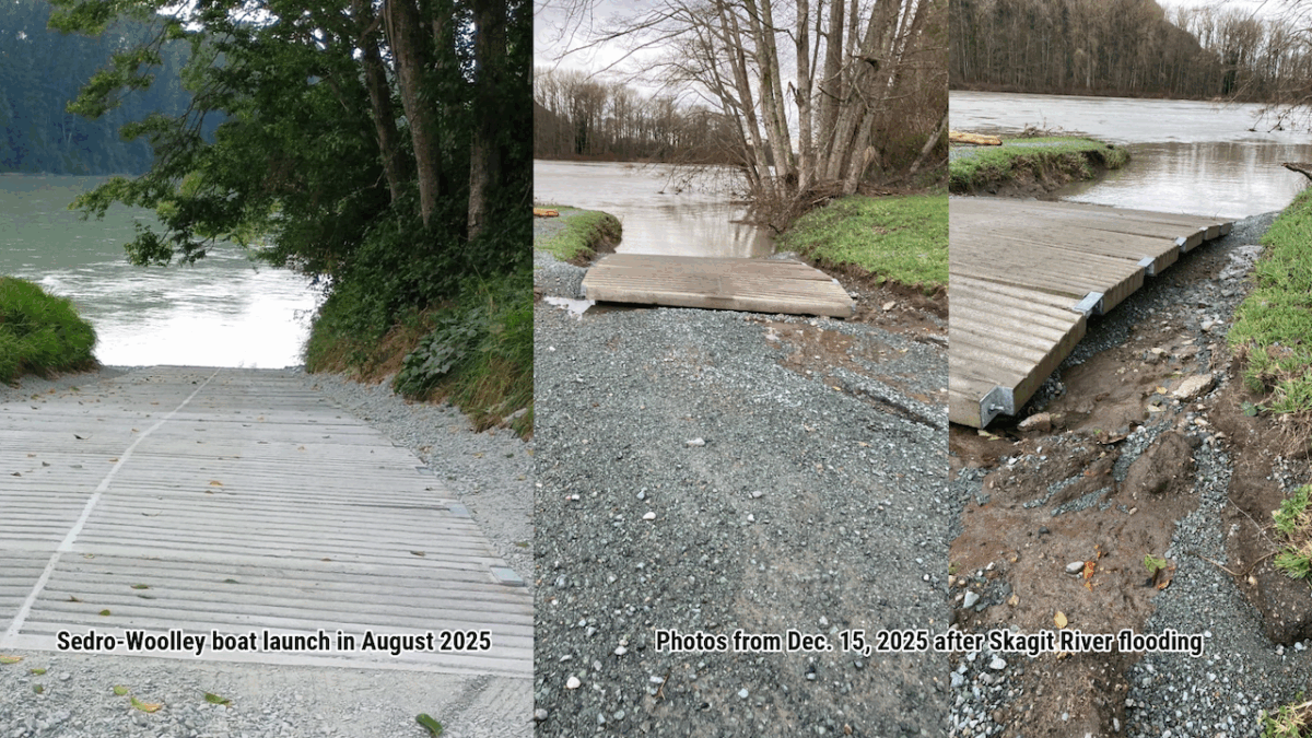 The Sedro-Woolley ramp on the Skagit was “severely damaged” and is being assessed for repairs and to determine whether closing the launch is needed to prevent further issues. According to Gunnell, it was just fixed last summer following 2021 flood damage.