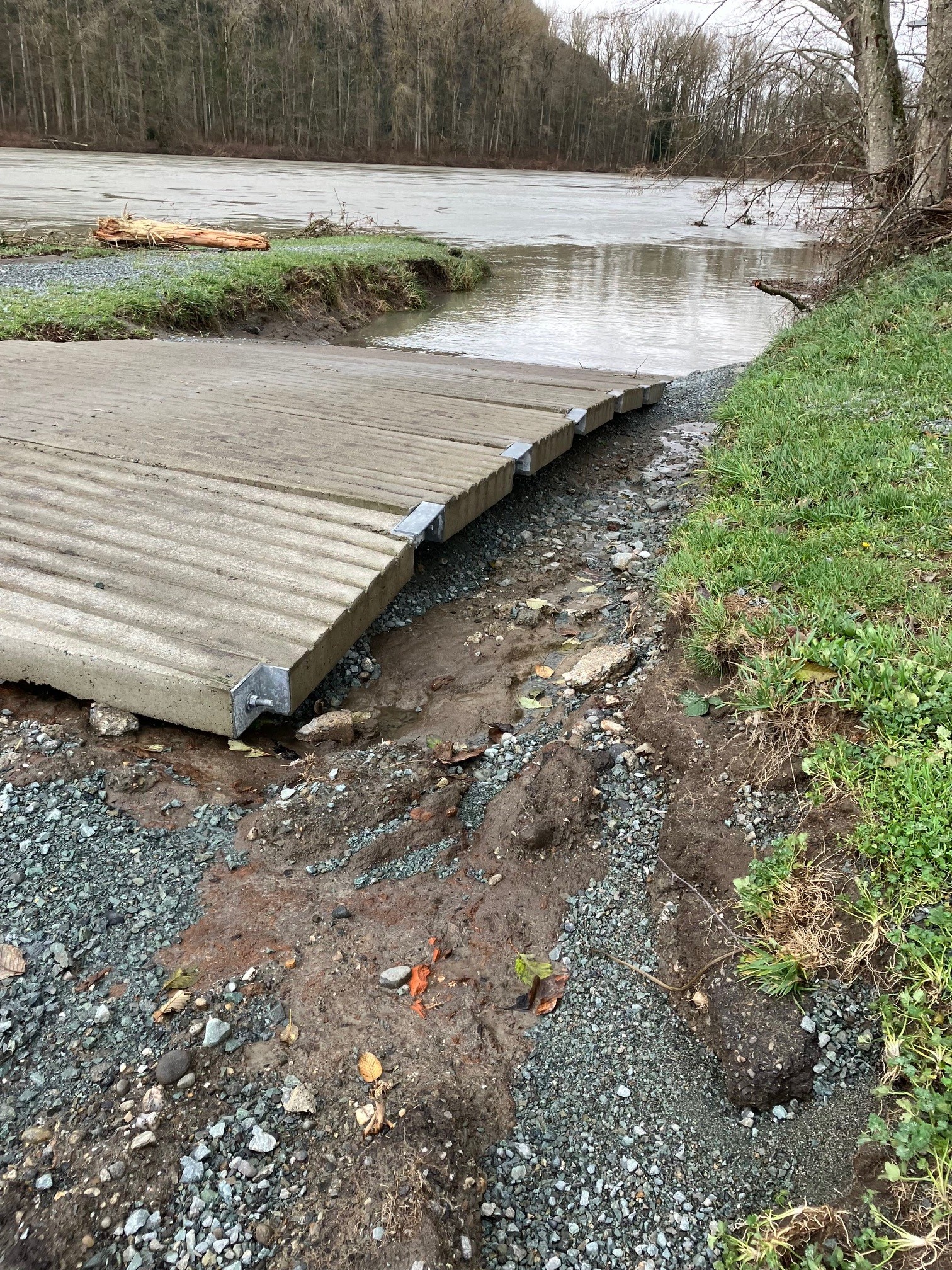 The Sedro-Woolley ramp on the Skagit was “severely damaged” and is being assessed for repairs and to determine whether closing the launch is needed to prevent further issues. According to Gunnell, it was just fixed last summer following 2021 flood damage.