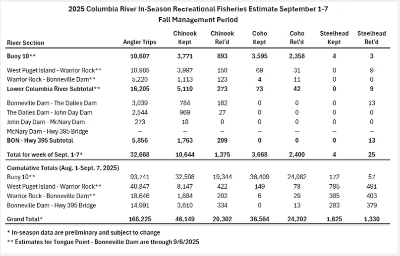 Preliminary Lower Columbia River and Washington Tributary Sport Summary – September 1-7, 2025