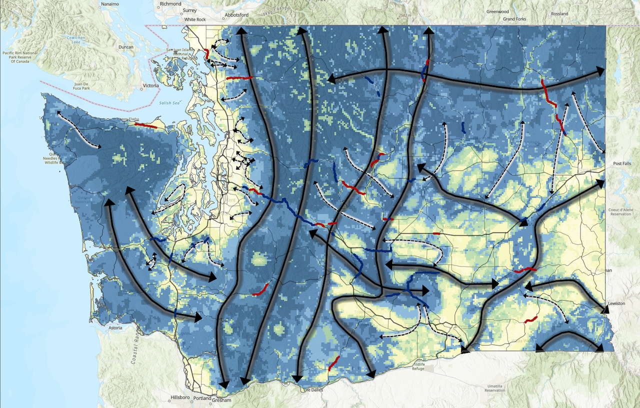 BHA says some 5,000 deer a year die along state roads due to vehicle collisions, “a significant limiting factor on healthy and abundant ungulate populations,” and maps in that action plan highlight highways cutting through the ranges of three important hunted herds – whitetails in the US 395 corridor north and south of Colville, Okanogan muleys along northern stretches of US 97 and Chelan County deer along US 2 – as well as larger wildlife connectivity corridors between big areas of intact habitat.